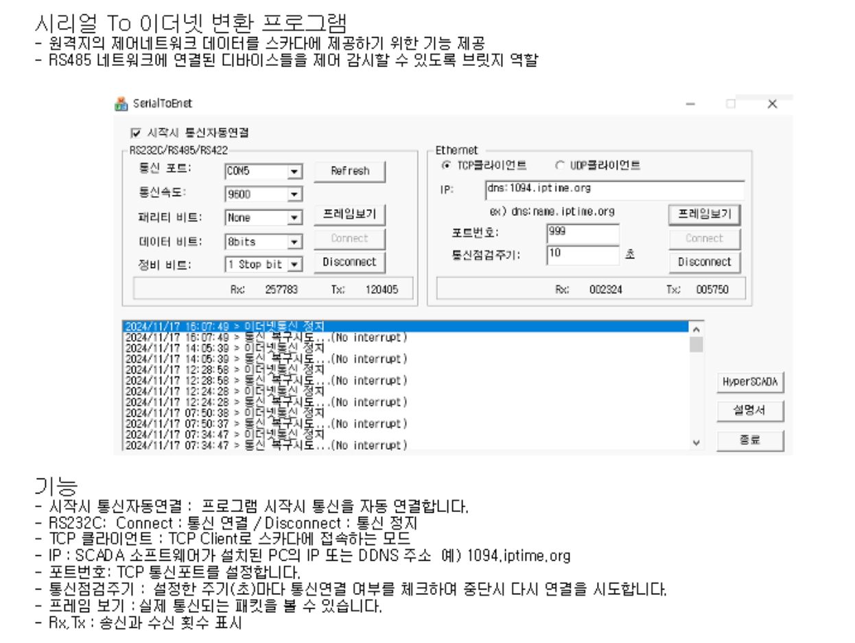 소프트웨어는 하이퍼 스카다 다운로드후 설치한 폴더에 "SerialToEnet.exe" 프로그램을 이용하면 가능합니다.