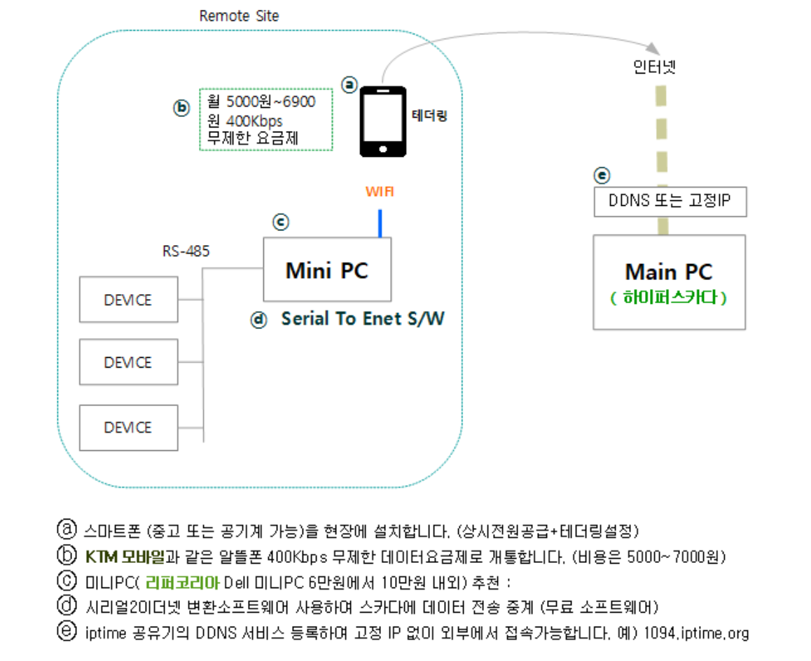 * USIM 개통시 매달 사용료 부담 (고객사) * 모니터링 PC도 리퍼코리아와 같은 저사양 MINI PC나 일반 PC등으로 하이퍼스카다 설치하여 웹 서비스 가능 | ||||